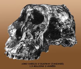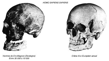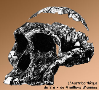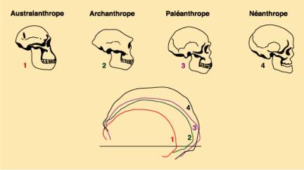 La configuration du crâne et le volume du cerveau des ancêtres de l’homme évoluent au même rythme que leur aspect physique. Le cerveau des Australanthropes est d’environ 600 cm3 ; celui des Archanthropes de 1000 cm3 ; celui des Paléanthropes de 1500 cm3 et enfin celui des Néanthropes de 1400 cm3.