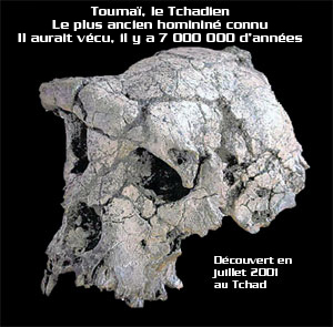 En juillet 2001, une découverte extraordinaire est faite au Tchad dans le désert du Djourab. On y découvre TOUMAÏ, un australopithèque ayant vécu il y 7 millions d'années. Celui-ci serait le plus ancien connu à nos jours. TOUMAÏ mesurait environ 1 mètre et pesait près de 35 kilos et serait un mâle. Il vivait dans les forêts qui jouxtaient le voisinage d'un lac ou d'une rivière. La découverte de TOUMAÏ à 2500 km à l'ouest du rift est-africain a changé les anciennes théories des paléontologues croyant que l'humanité s'était développée à partir de l'est du rift (théorie formulée en 1982 par Yves Coppens). TOUMAÏ signifie "ESPOIR DE VIE" en langue gorane. Ce nom a été choisi par le Président du Tchad. Ce nom désigne les enfants nés juste avant la saison sèche et leur chance de survie est alors plus limitée.